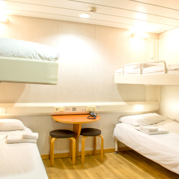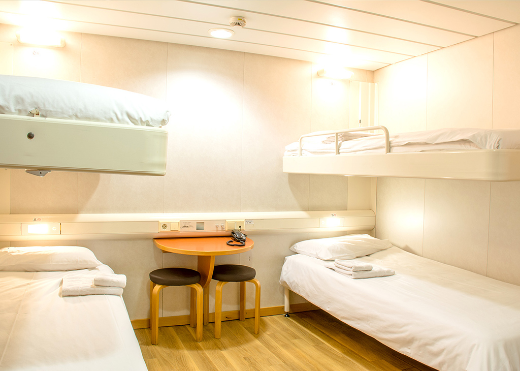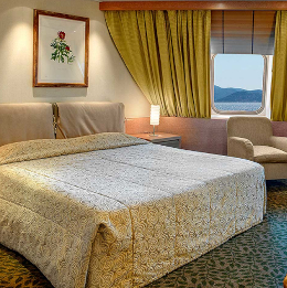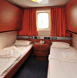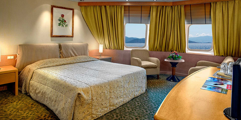 Alle Kabinen sind in der Regel klimatisiert und enthalten ein eigenes Bad. Sie können zwischen Innenkabinen und Kabinen mit Blick aufs Meer (Außenkabinen) wählen. Weiterhin gibt es Suiten bis zu vier Personen und einen Wohnbereich.